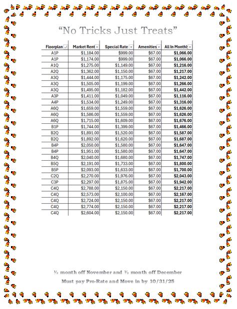 The temperatures aren't the only thing that's dropping. Check out our lowest rates of the year! These scary good prices will vanish soon so don't be ghoulish and miss out. Secure your new home for only $99 today! 📍 Apply before the witching hour ends — November 1st! 📞 Call now… your boo-tiful new home awaits! 🏠✨